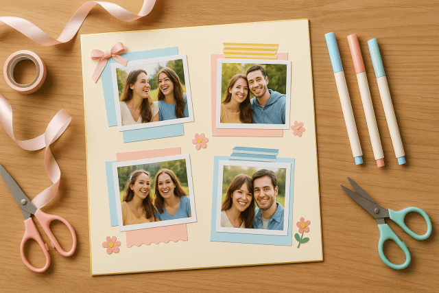 デザイン豊富なマスキングテープやカラフルなシールは、写真を目立たせるのに役立ちます。写真の縁にマスキングテープを配したり、角にシールを添えることで、楽しげで華やかな雰囲気を演出できます。